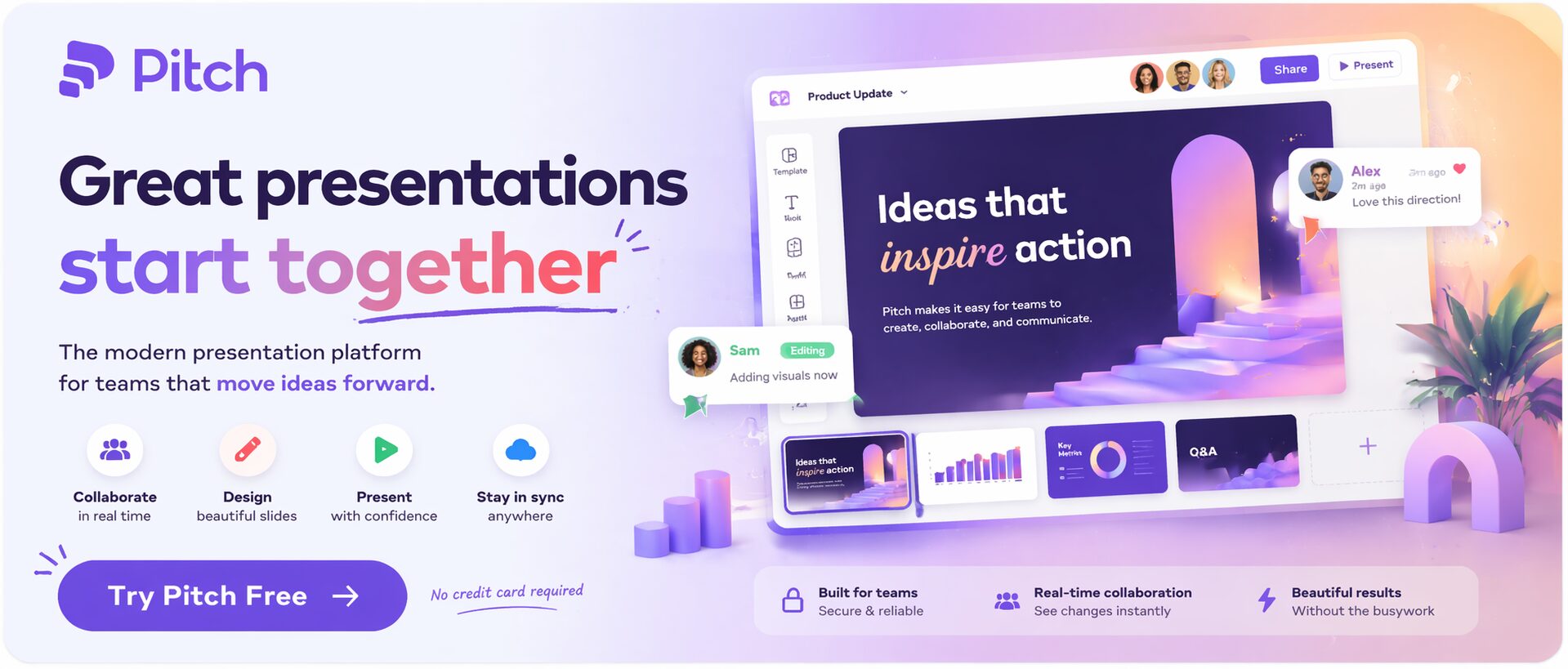 Beautiful.ai and Pitch are both strong for collaboration, but Pitch is more focused on teams while Beautiful.ai focuses more on slide quality and speed.